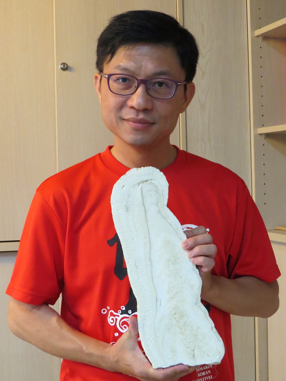 沈川洲教授手持石筍標本。