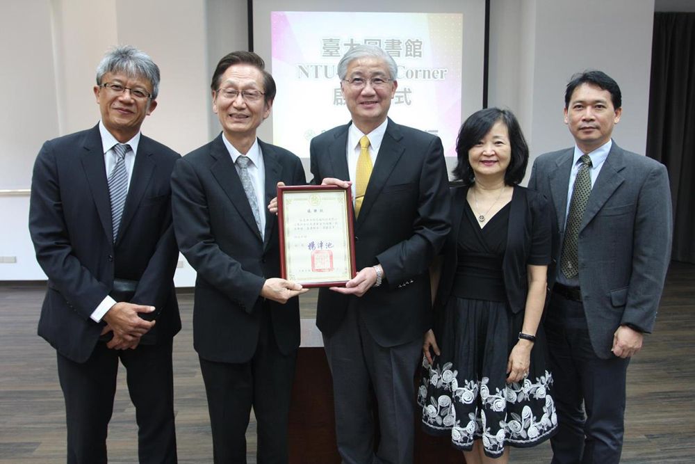 臺大楊泮池校長(右三)、圖書館陳雪華館長(右二)、副館長陳光華教授(右一)以及華碩電腦施崇棠董事長(左二)、謝明傑副總裁(左一)親臨參與啟用儀式。