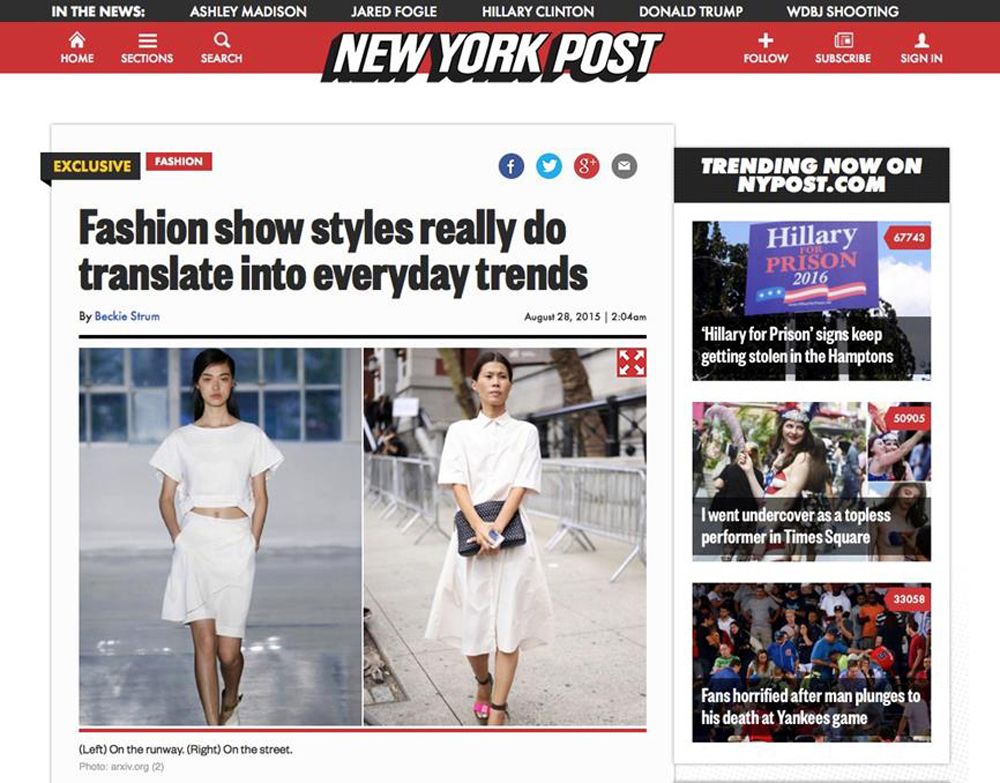 許多研究指出,紐約市為時尚潮流的引領者,每年每季的紐約時裝秀 (New York Fashion Show) 並為當地經濟帶來相關可觀的收入與促進當地的發展。由美國紐約州羅徹斯特大學及臺大電資學院徐宏民教授等所組成的五人團隊,經由前瞻的影像辨識以及社群媒體探勘技術,獲得初步耀眼的成果,並獲得紐約郵報 (New York Post) 的專題報導。
