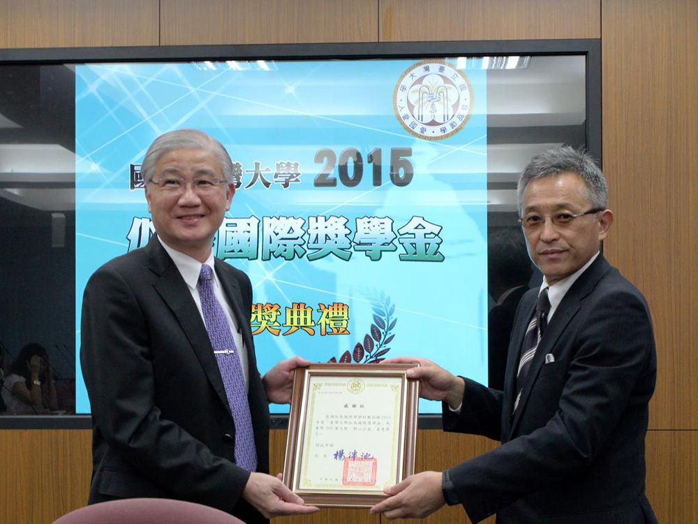 今年9月24日於本校舉行了「第一屆似鳥國際獎學金」頒獎典禮,頒發獎狀及獎學金每名10萬元。(圖左為楊校長,右為似鳥昭雄先生)