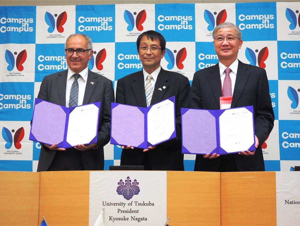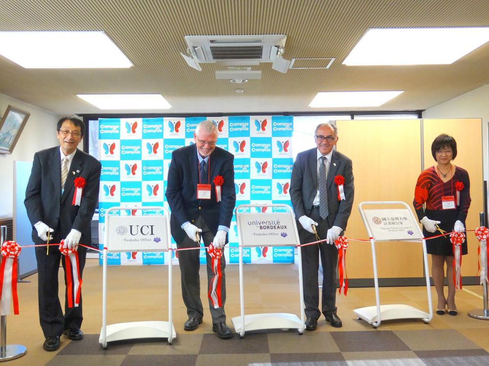 除了師長學生交流活動之外,本校與筑波大學橫跨各領域的多元實質合作方案也呈現了豐碩的成果。臺大、法國波爾多大學、美國加州大學爾灣分校於筑波大學的海外辦公室於本屆TGSW舉辦開幕剪綵活動,由本校張淑英國際長代表參加並致詞,象徵成立跨校的緊密互聯網。也藉著此次三校校長齊聚的難得機會,舉辦臺法日三校行動校園共同執行合作協議書與具前瞻性的跨國創新學程(GIP-TRIAD)合作協議書;稍早,本校生農學院也與筑波大學生命環境科學研究所簽署雙學位合約。參與師生皆見證了多年教育與研究合作模式的努力成果。