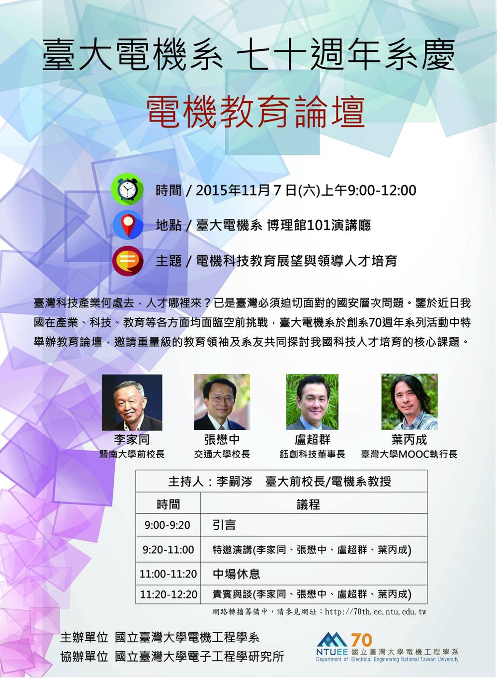 電機70週年系慶系列論壇活動,首先登場的是11月7日上午的教育論壇及11月7日下午的產業論壇,假國立臺灣大學電機資訊學院博理館一樓101演講廳舉行。11月7日上午的教育論壇邀請總統府資政李家同、國立交通大學校長張懋中、臺灣半導體產業協會理事長暨鈺創董事長盧超群、臺灣大學MOOC執行長葉丙成教授,由臺大前校長李嗣涔教授主持,共同對談與激盪臺灣科技教育展望與人才培育的迫切議題。