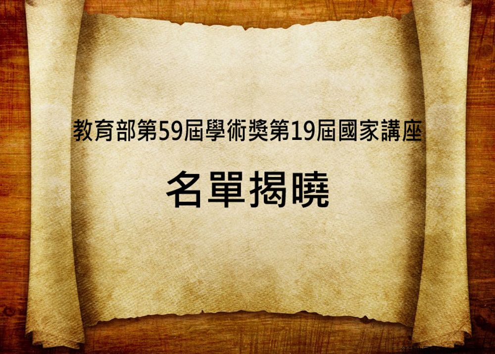 教育部104年10月14日公布第59屆學術獎及第19屆國家講座得獎名單,臺大共六位教授獲此殊榮。教育部為獎勵學術研究,提高教學與研究水準,並促進大學發展其特色,特設置國家講座及學術獎,各分置人文及藝術、社會科學、數學及自然科學、生物及醫農科學、工程及應用科學等5類科,其中人文及社會類科獎額各至多2名;其餘3類科獎額各至多3人。國家講座設置期限為3年,除由學校配合提供該講座主持人所需之資源外,教育部每年獎助新臺幣100萬元(包括講座主持人個人獎金及教學研究經費各50萬元);學術獎得獎人則將獲頒榮譽證書及獎金新臺幣60萬元。本屆國家講座申請件數為33件,學術獎申請件數為88件,得獎人經過嚴謹的遴選過程在眾多優秀學者中脫穎而出,獲得殊榮。本校獲獎名單如下: