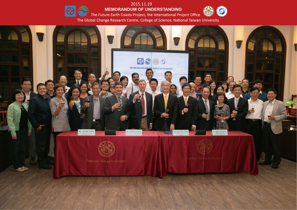 由楊泮池校長及理學院劉緒宗院長為代表於2015年11月19日下午5:30分在校史館舉行本校全球變遷中心與未來地球的海岸計畫辦公室 (Future Earth Coasts) 簽屬合作備忘錄 (MOU),以期達到雙方合作研究及互惠。