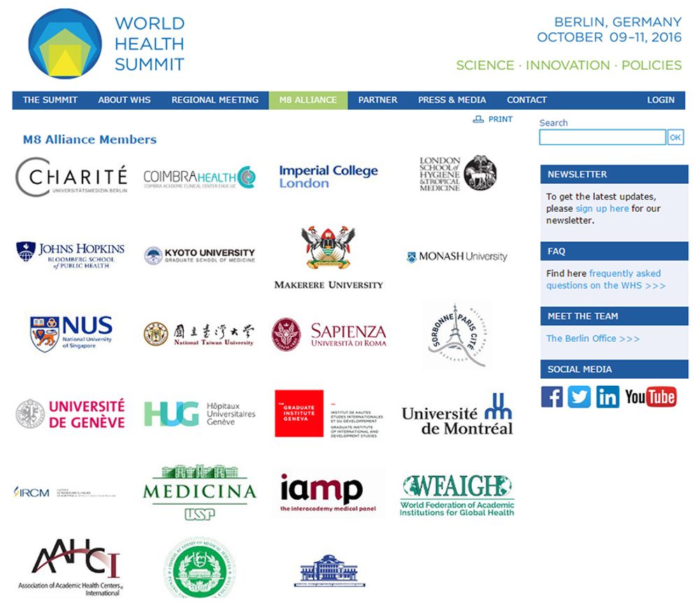 M8 Alliance以優異的教育研究合作網絡聞名,2009年與世界衛生高峰會同時創立,每年組織WHS區域會議及年會,是世界健康衛生領域最主要的組織之一。M8 Alliance組織的世界衛生高峰會,目的在建立地區間的對話,拓展傳播交流的途徑,藉由訊息溝通分享,以促進全球的醫療衛生發展。M8 Alliance目前成員來自16個國家,各國以大學為參與單位,現有19所頂尖大學及4間知名研究機構(官方網站:http://www.worldhealthsummit.org/m8-alliance.html)。