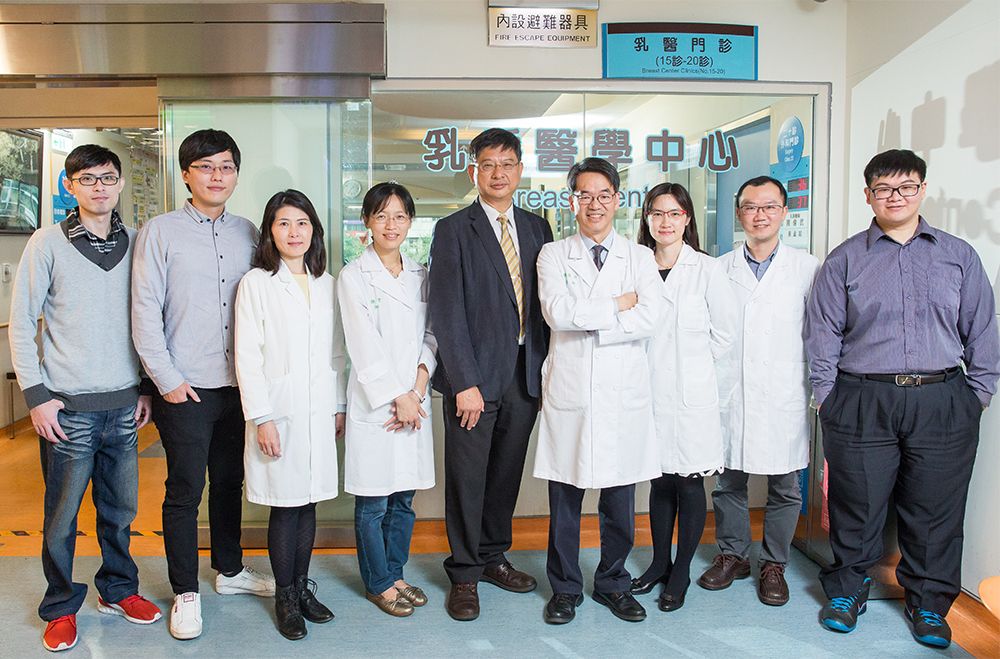 臺大醫院乳醫中心黃俊升主任(右四)、臺大資訊所張瑞峰教授(右五)及三位資訊所博士生(左一、二及右一)。
