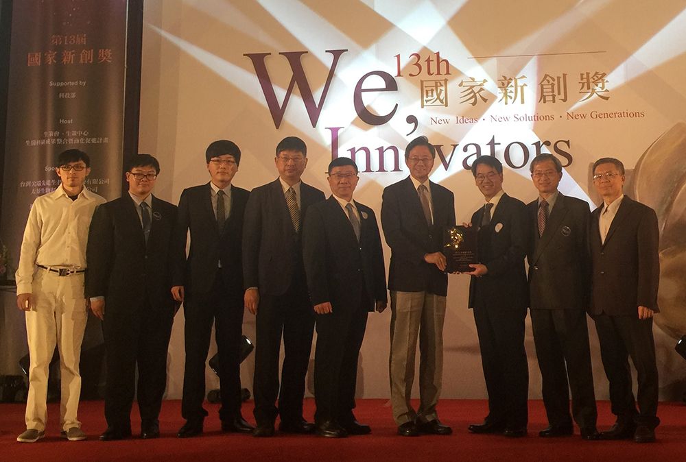 臺大醫院及臺大資訊共同硏發「手持式超音波乳房影像掃描定位及診斷輔助系統」獲得生策會第13屆國家新創獎-最佳產業效益獎、臨床新創獎,頒獎人張善政會長(右四)、臺大醫院乳醫中心黃俊升主任(右三)、臺大資訊所張瑞峰教授(左四)及三位資訊所博士生(左一起)。