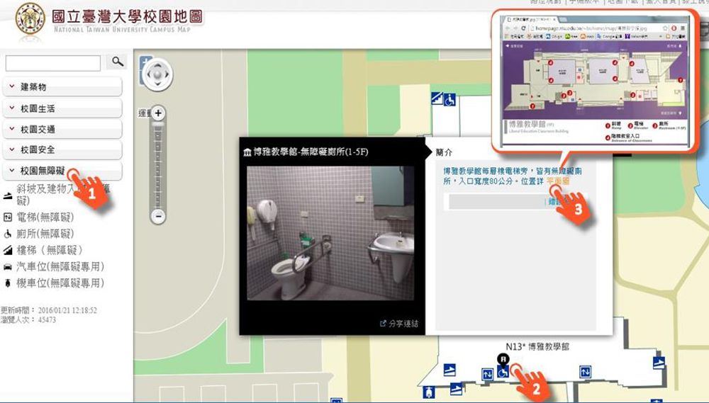 校園內大部分地區已設置無障礙設施,2015年,總務處再將資訊集結起來,彙整至校園地圖後,行動不便者在電腦前就能取得各建物坡道、入口、電梯、廁所、停車位的位置,判斷是否符合個人需求、規劃動線,減少在校園裡繞路的不便。為了製成地圖,每項設施位置都經過現地拍照、確認、再標示在GIS系統中,並依據行動不便同學的實際建議,提供廁所內的照片、廁所入口和電梯入口的寬度等資訊,甚至針對教學大樓繪製平面圖,讓行動不便同學不再煩惱該從那裡進入大型階梯教室。