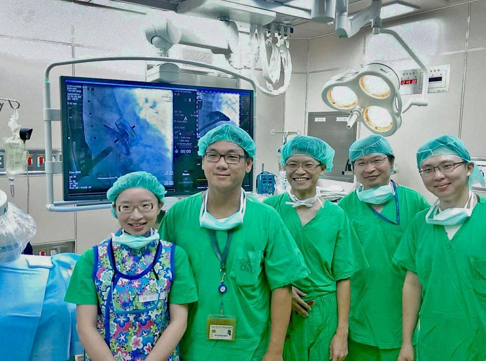 臺大左心耳封堵心導管手術團隊於術後合照,左起心臟科鍾一瑋總醫師, 蔡佳醍教授 ,雲林分院邱富群醫師,臺大麻醉科鄭孝良醫師,及新竹分院林廷澤醫師,另螢幕所現即為植入病人體內之左心耳封堵器。
