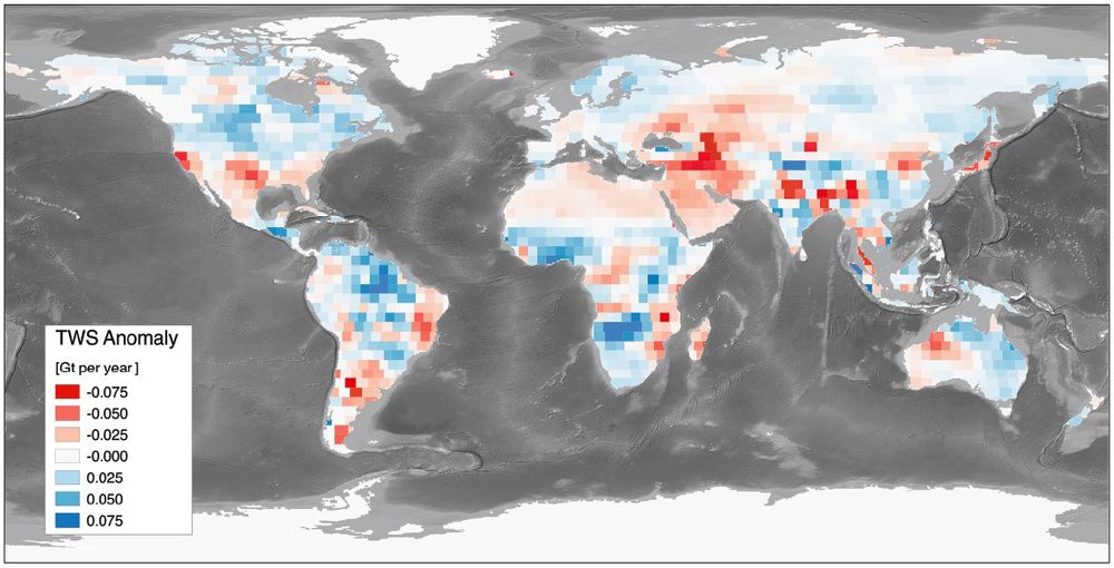 GRACE 所觀測到的陸地水含量的趨勢變化從2002到2014年。(Reager et al., 2106)