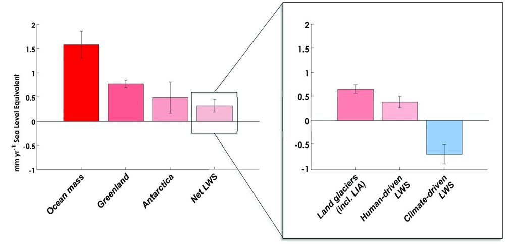 全球水循環跟氣候的變化息息相關,但卻難以被觀測,特別是陸地上的水文過程,新的衛星遙測技術-GRACE提供了一個解決方法。GRACE衛星在2002年3月發射到太空後開始提供資料。跟其他衛星不一樣的地方在於,GRACE是由兩顆衛星所組成,而這兩顆衛星的距離會因為地球上的重力不同產生變化,由於水循環是影響地球重力變化的一個重要的因素,因此藉由記錄這兩顆衛星的距離變化將可進一步了解地球上的水循環,以及觀測水在陸地與海洋上的分佈與隨著時間的變化。2002年至2014年間,在格陵蘭和南極大陸的冰層與高山冰河持續融化的同時,經由GRACE觀測到有較多的水累積在土壤層與地下水層,而這些陸地多吸收的水,每年減緩海平面上升的速度約0.71毫米。