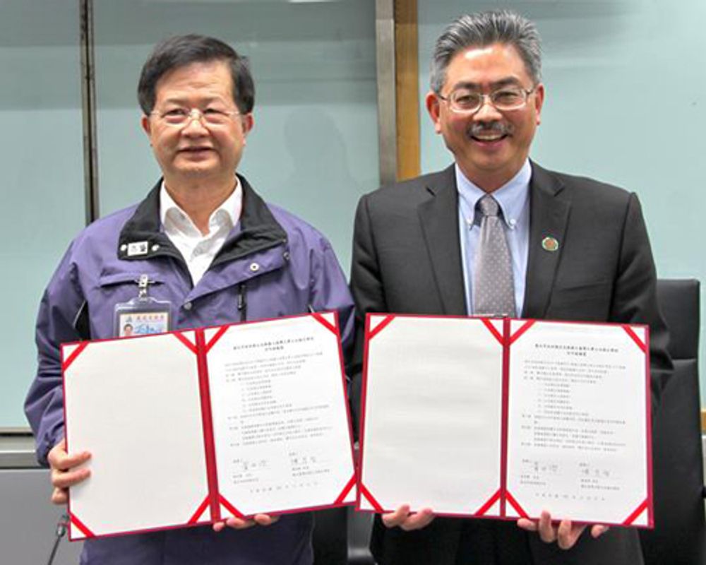 臺北市衛生局黃世傑局長與臺大公衛學院陳為堅院長在簽約後合影。