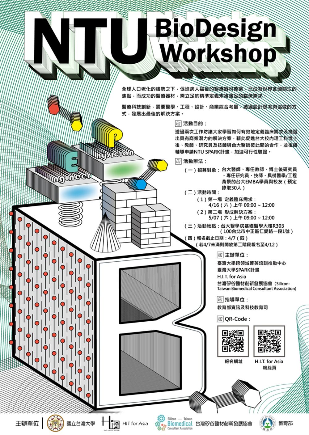 您是醫師卻不懂工程嗎?您是工程師想聆聽每天在白色巨塔內聲聲呼喚的臨床需求嗎?歡迎報名「NTU Biodesign Workshop」,帶您一探究竟!