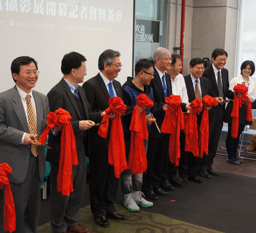 開幕活動剪彩貴賓由左至右為:臺大風險社會與政策研究中心主任周桂田教授、臺大生醫倫理中心主任蔡甫昌教授、臺大公共衛生學院院長陳為堅教授、南風攝影展攝影作者鐘聖雄先生、臺大校長楊泮池教授、南風攝影展攝影作者許震唐先生、臺大公共衛生學院副院長詹長權教授及臺大社會科學院院長蘇國賢教授。