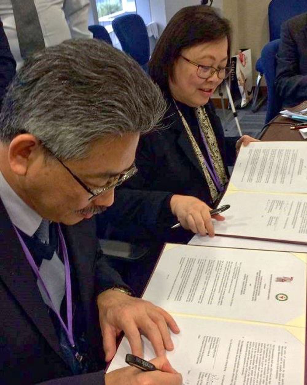 公衛學院陳為堅院長與中大人文學科研究所熊秉真所長(後) 進行雙邊合作備忘錄簽署儀式。