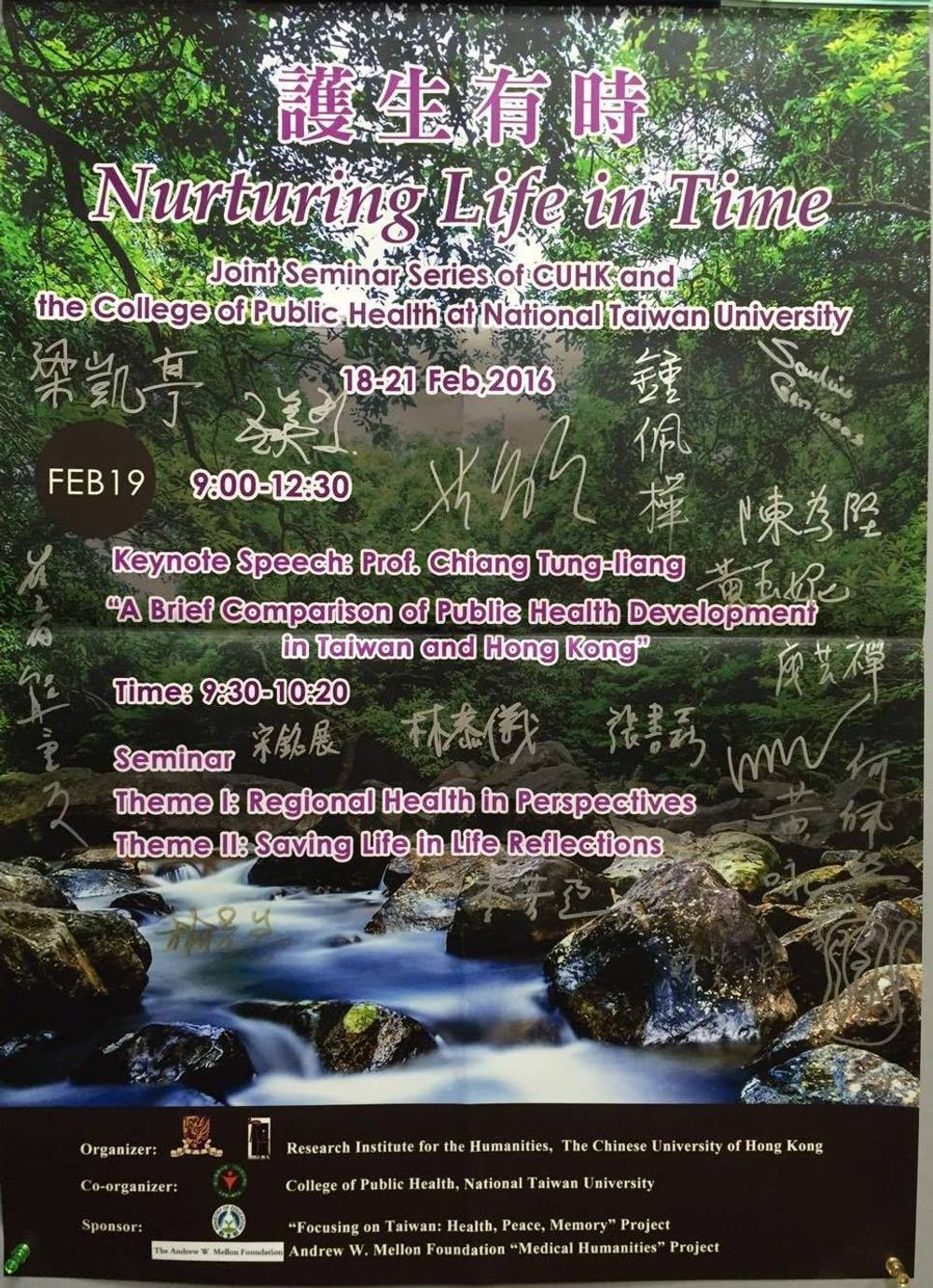「護生有時」聯合學術討論會海報,上有參與學生與師長簽名留念。