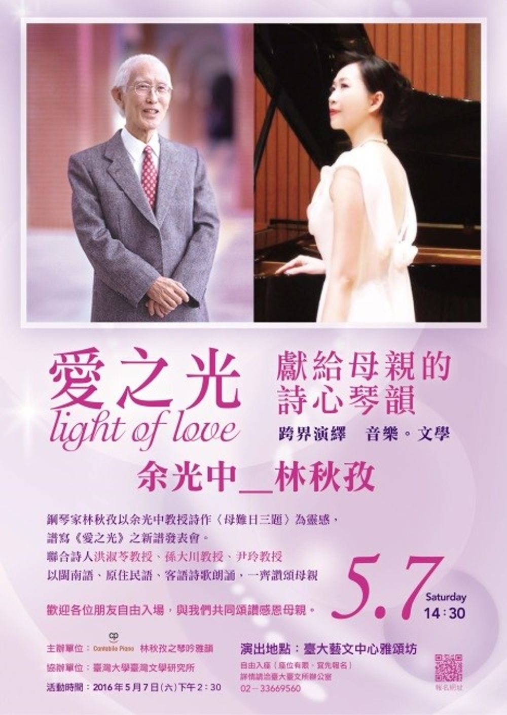臺大傑出校友,國立中山大學榮譽退休教授,余光中教授,今年5月7日(六)下午2時30分,獲琴吟雅韻創辦人/鋼琴家及大鍵琴家林秋孜教授及臺大臺灣文學研究所之邀,於母親節前夕,將於臺灣大學藝文中心雅頌坊舉辦「2016母親節詩歌音樂會:愛之光──獻給母親的詩心琴韻」詩歌音樂會,以詩歌琴曲頌讚母親。