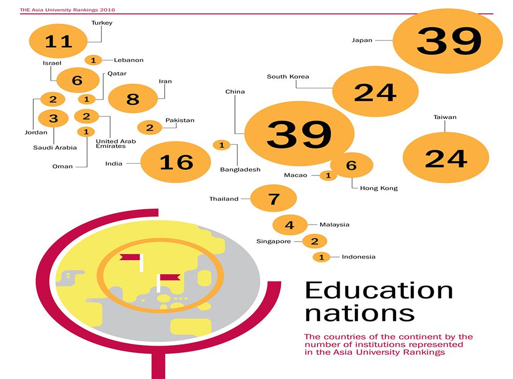 英國泰晤士報高等教育增刊(Times Higher Education, 簡稱THE)6月21日公布2016年亞洲大學排名,臺灣共有24所大學進入前200名,本校排名第15名,較去年進步2名,為臺灣排名最佳之大學。THE係第4次公布亞洲地區大學排名,本次排名涵蓋全亞洲大陸。評比內容含五大項指標:教學(25%)、研究(30%)、論文被引用情形(30%)、產學合作(7.5%)及國際聲望(7.5%),檢視大學之核心任務--教學、研究、知識轉移和國際聲望。