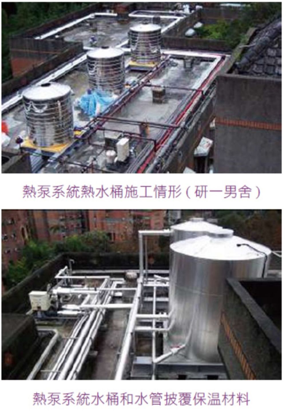 學生宿舍原本採用天然氣鍋爐熱水系統,老舊耗能;且有熱水出回水管路及熱水儲槽保溫不良之情形,造成過多的熱損失與能源浪費等問題,於是經評估後,將部分宿舍改為熱泵熱水系統。
