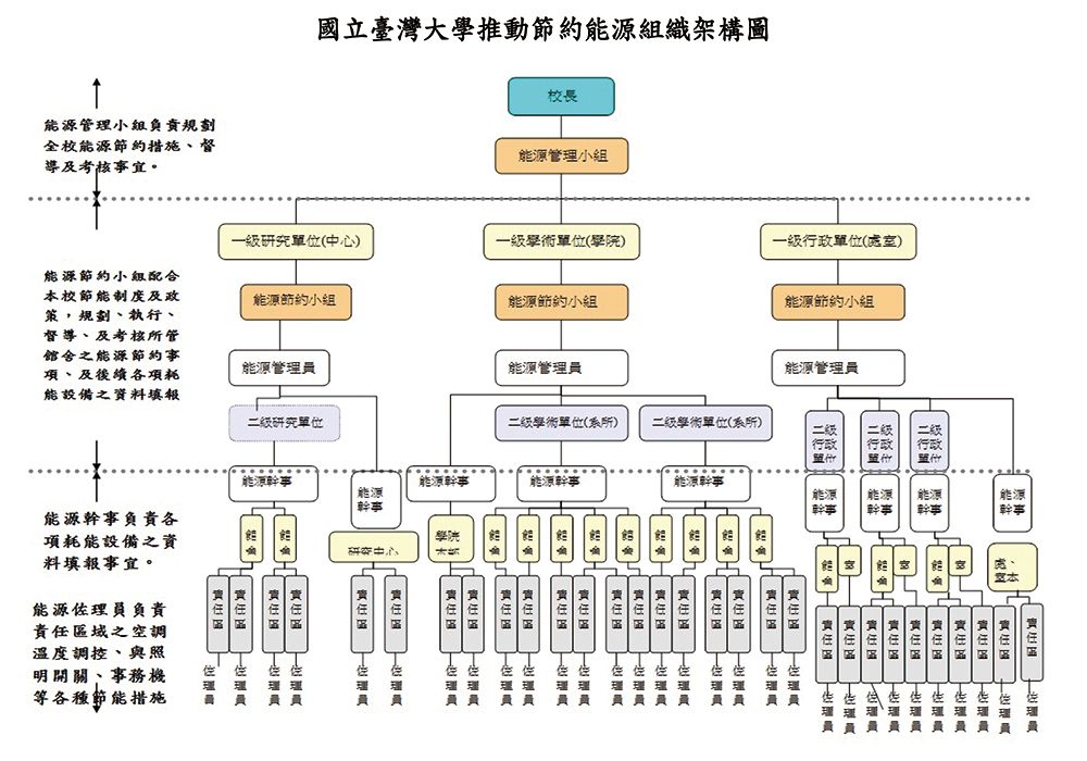 本校自97年6月起建立本校能源管理組織,本校水電管理專責單位為「能源管理小組」,各一級單位為「能源節約小組」。組織架構採分層落實方式組成,進行各項管理、執行、督導、考核、以及耗能設備之資料填報等事宜。