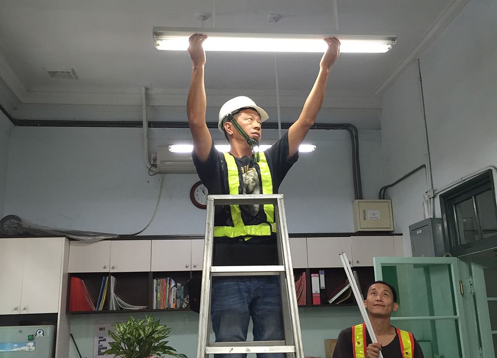 包括校園路燈更新為LED路燈、汰換傳統T8 燈具為高效率電子式T5 燈具、更換傳統消防燈具為LED 消防燈具,不但省電且設備壽命長,也節省維護費用。室內改用T5燈具後,可提高照度、減少更換頻率,提升教學研究品質。光是更換燈具,每年可節省電費約1,700萬元。