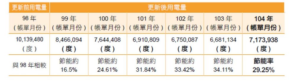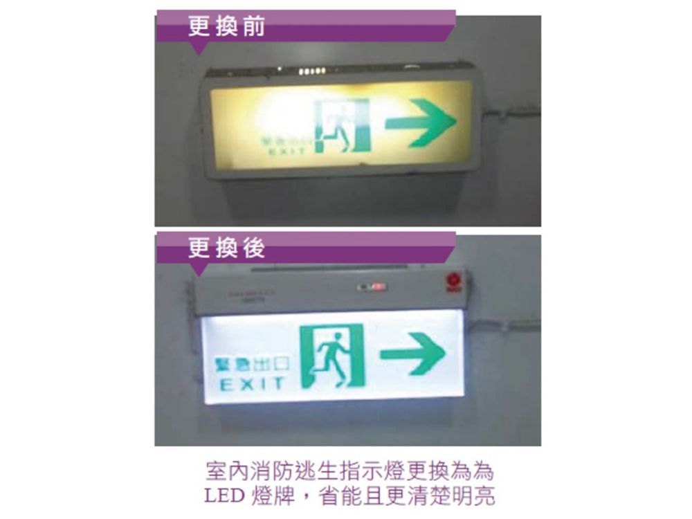 配合經濟部能源局99 年函示及政府節能政策辦理。總務處於100 年度補助各單位辦理消防燈具全面更換為LED 產品,並要求廠商提供較長之保固期限。統計99年至104年更換出口標示燈、避難方向指示燈更換前後之效益,總計約可節省用電43.7萬度,節省電費約131.1萬元。