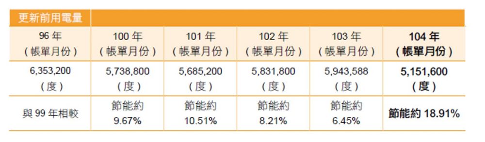 自99年以來本校持續將老舊T8 燈具汰換為T5 燈具,到104年已累積更換61,867 盞,每年至少節電433 萬度,相當於1,300 萬元電費,同時達到提高照度、減少更換頻率,提升教學研究品質。