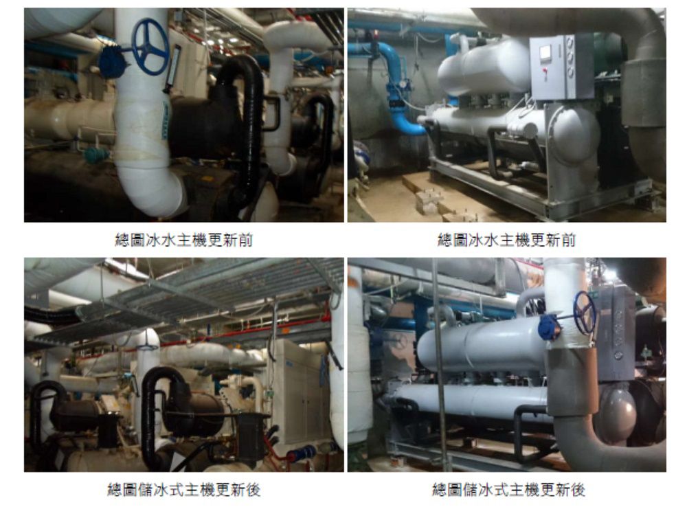 第二學生活動中心原有2 台老舊冰水主機,分別供應第二學生活動中心及集思會議中心冷氣來源,其冰水主機壓縮機已多次故障修護,運作效率低。配合總圖儲冰系統建置案,將汰換而尚堪使用的2台空調主機整理後,移至第二學生活動中心使用,103年10月已完工運轉中,每年約可節省12萬度用電量、約可節省30萬元。