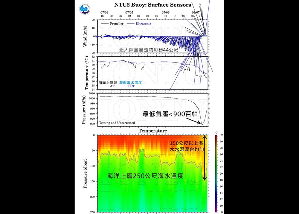 NTU2浮標即時傳送回7/4-7/7間之颱風觀測記錄資科圖,由上至下為風速風向、海面上氣溫與海表層水溫、氣壓、海洋上層250公尺海水溫度剖面。