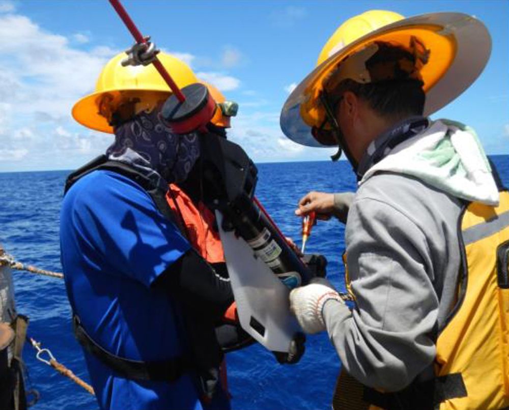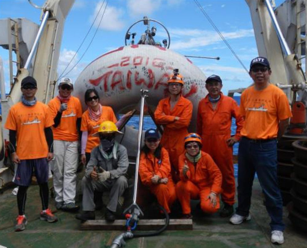 NTU1、NTU2浮標佈放經過。楊穎堅老師(右)領隊之海洋所浮標團隊合影。