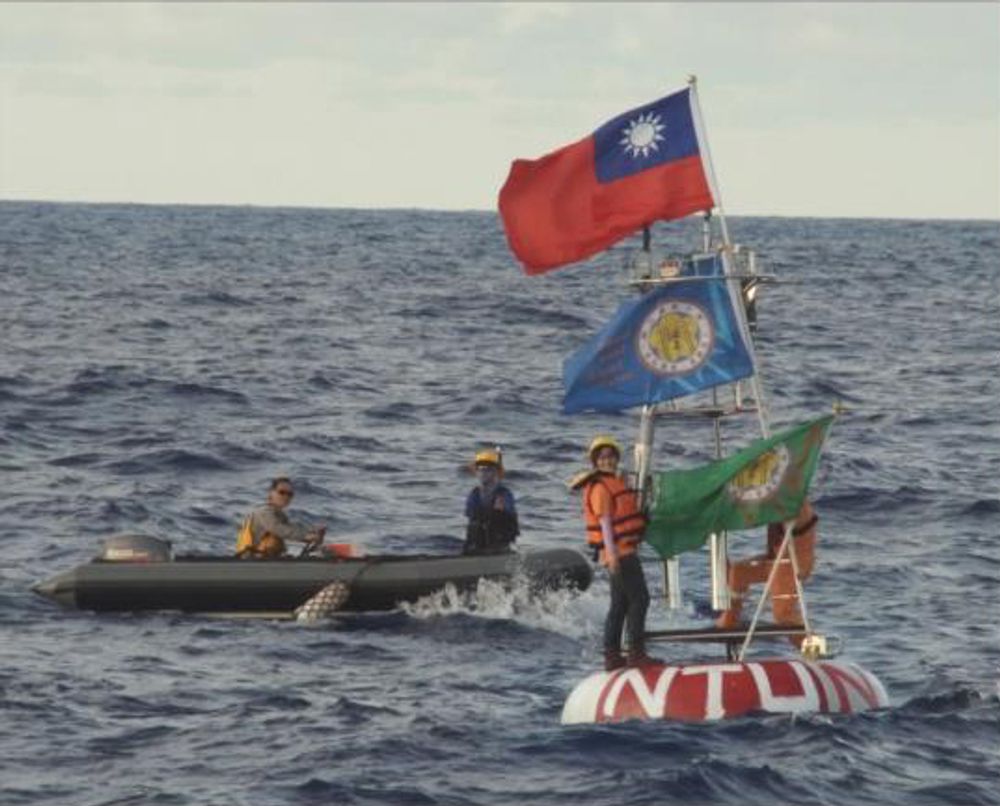NTU1、NTU2浮標佈放經過。橡皮艇帶工作人員踏上浮標做最後檢測,浮標上國旗和校旗在浮標運作後即拆卸下來。