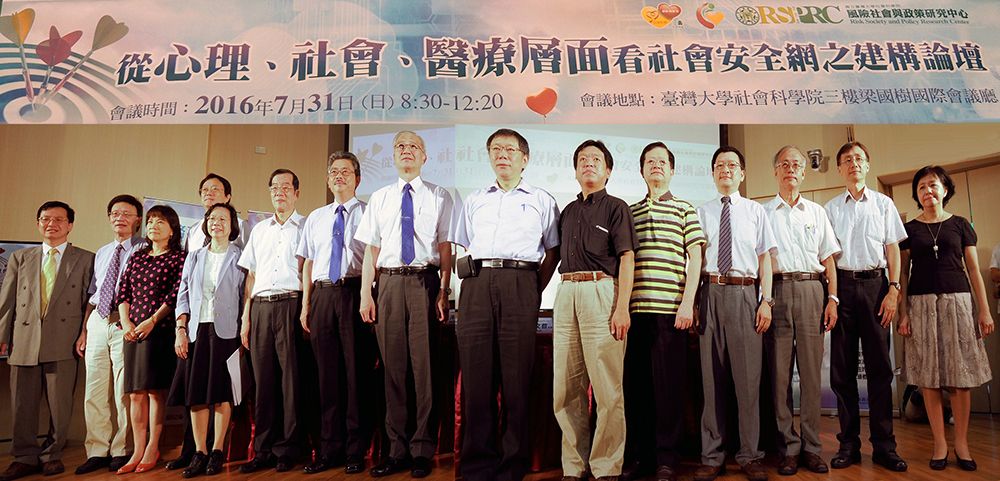由臺灣大學、臺大風險社會與政策研究中心及臺北市政府聯手舉辦「從心理、社會、醫療層面看社會安全網之建構」論壇,針對「心理與醫療層面」、「社會安全網層面」進行共同討論,圖為與會貴賓合影。