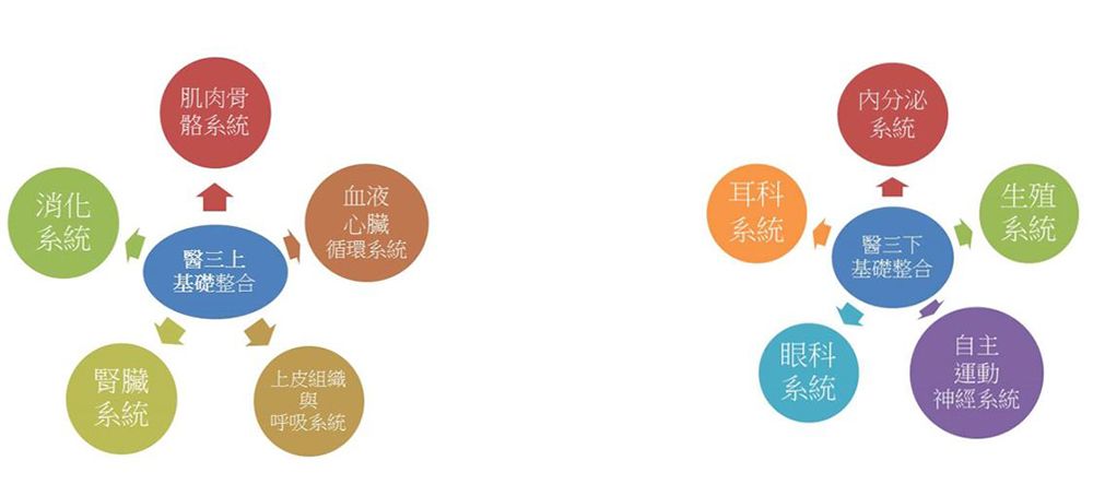 醫學系課程整合已執行多年,課程大系統整合分為兩階段,第一階段為基礎學科的課程整合,在基礎醫學訓練階段,將各個基礎與相關臨床醫學依教學內容作系統主題式的整合。第二階段為基礎與臨床學科的課程整合。各學科互相配合與協調,提供相輔相成的核心必要知識,並減少教學內容的不連貫與重覆,與基礎臨床內容過多、難以消化的弊端,使學生在學習時了解各基礎學科知識的關係與臨床使用,增強知識整合與應用。