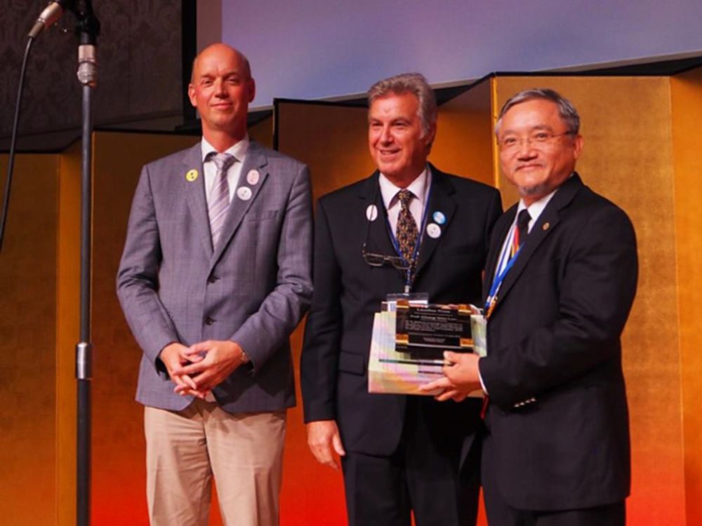 國際晶體生長學會會長Prof. Fornari與獎章委員會主席Prof. Vlieg 頒予藍崇文教授(右) Laudise Prize。