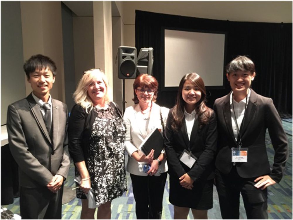 學生游弘晟(左一)、徐阡晏(右二)、陳咨羽(右一)與ASME IDSC主辦人及評審合照。
