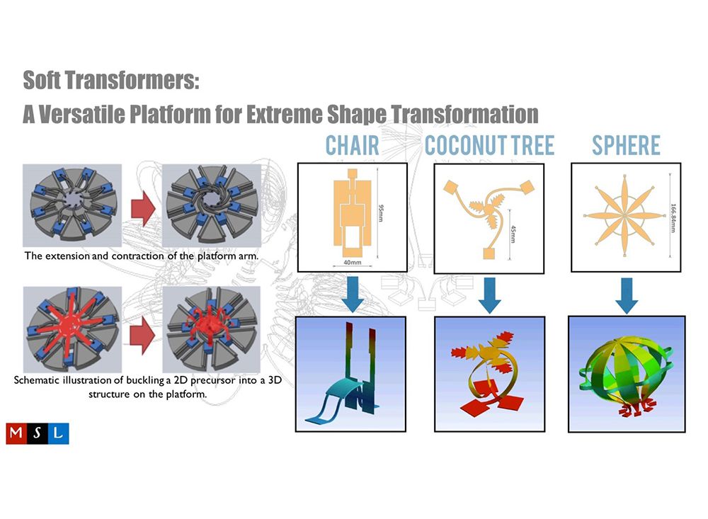 莊嘉揚教授團隊利用自行開發的平台進行實際驗證挫曲大變形將簡單二維平面設計可逆變形成複雜三維立體結構的可能性。
