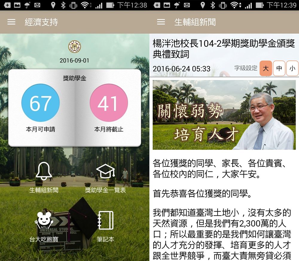 為加強宣導,學生事務處規畫開發「臺灣大學獎助學金即時通APP」並於105學年度開放下載,提醒學生及時提出申請、善用獎助學金資源,以貫徹楊泮池校長「關懷弱勢培育人才、獎勵優異回饋社會」的教育理念。