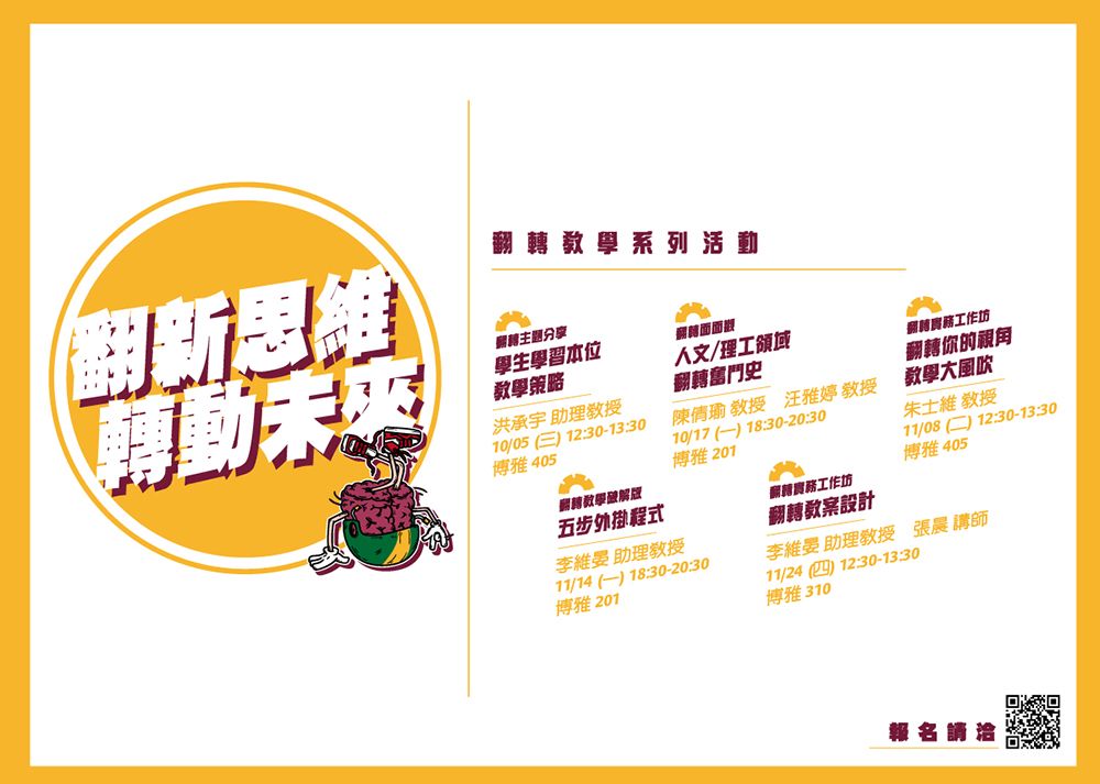 接下來其他精彩場次如下,歡迎踴躍報名,11/14 (一) 18:30 翻轉教學破解版:五步外掛程式;for 教師11/08 (二) 12:30 翻轉實務工作坊:翻轉你的視角,教學大風吹;11/24 (四) 12:30 翻轉實務工作坊:翻轉教案設計。