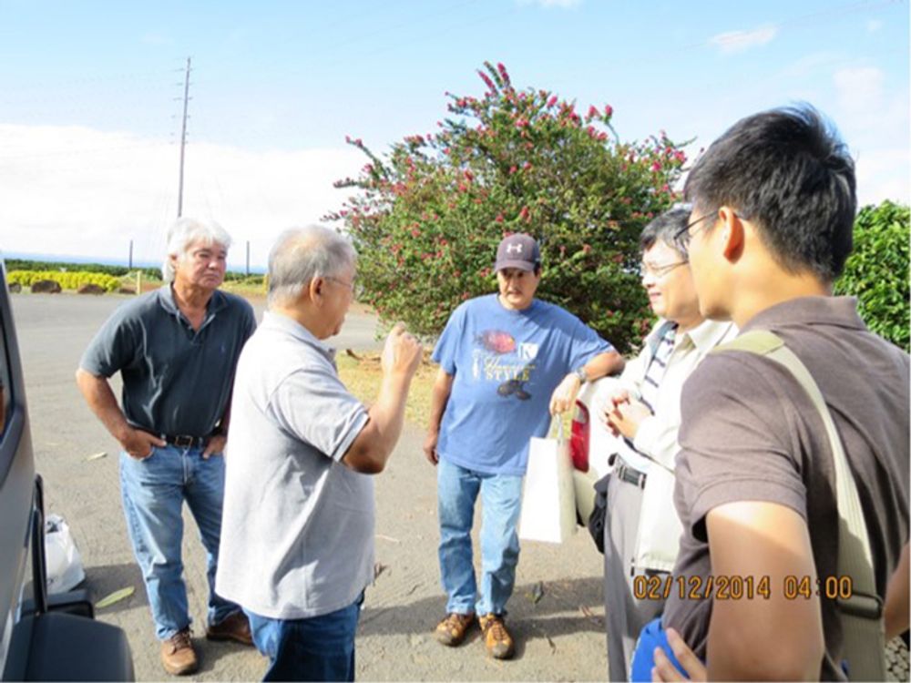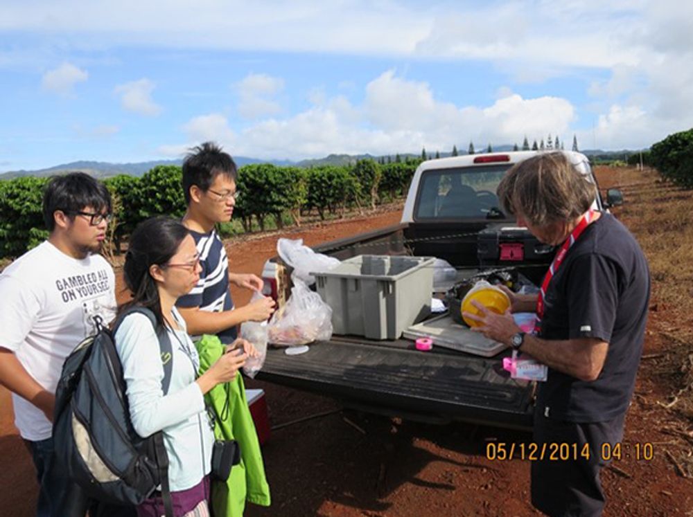 研究團隊與美國農業部太平洋地區研究中心(Pacific Basin Agriculture Research Center, USDA)進行地中海果實蠅監測之合作研究,於夏威夷Kauai島Kauai Coffee Farm與夏威夷大學Prof. Mau、Mr. Robin以及USDA PBARC技術人員Russel討論後續幾天監測的實驗設計。