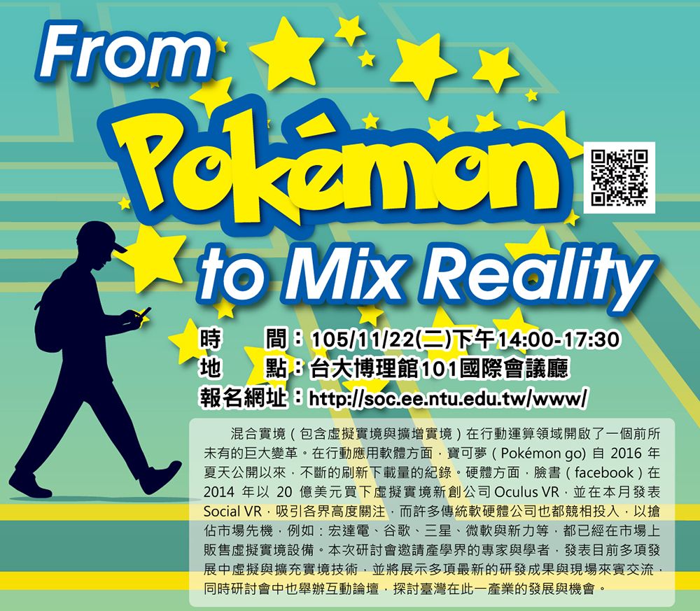 臺大寶可夢論壇-From Pokemon to Mix Reality將於11月22日舉行。