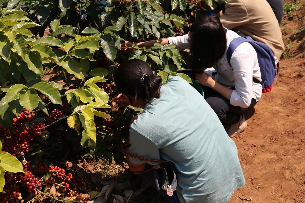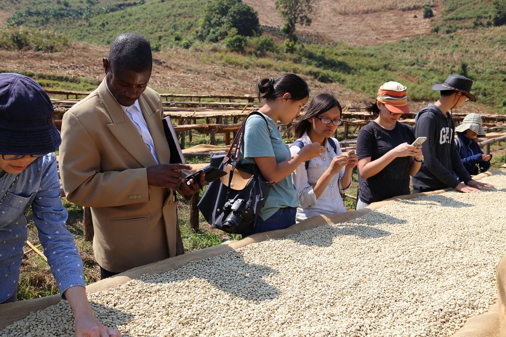 實習學生(左二位)檢視曬乾製程中的生咖啡豆。