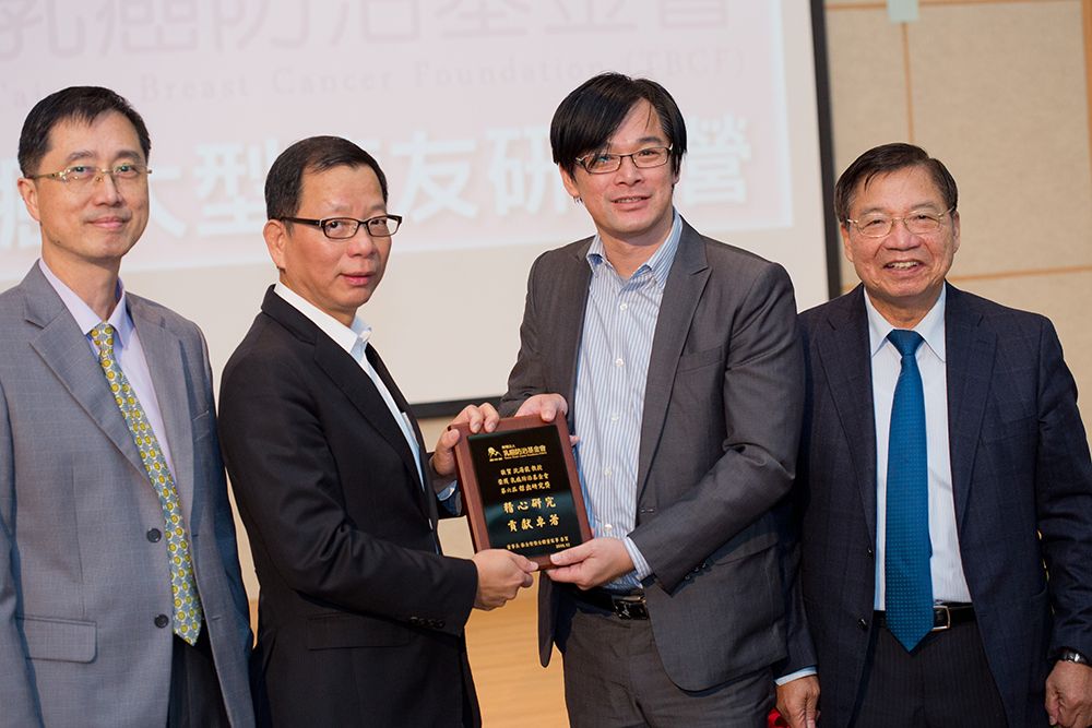 由左至右:國防醫學院俞志誠教授、華電聯網陳國章董事長、臺大沈湯龍教授及乳癌防治基金會董事長張金堅教授。