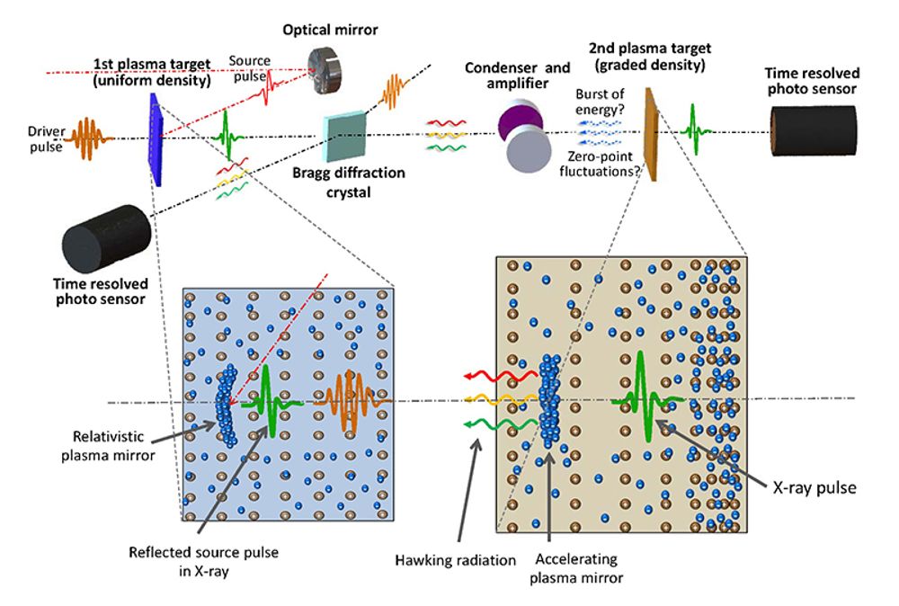 當超強雷射穿越電漿時,在相互作用下,會使得電漿中的自由電子被推到雷射的後方,堆積成一面極高密度的電漿反射鏡,並且尾隨雷射同步前進。作者們指出,運用奈米技術,可以製造出密度逐漸加大的薄膜靶。超強雷射打進薄膜後,會瞬間把薄膜融成電漿並產生反射鏡。而當雷射及電漿反射鏡逐漸進入薄膜中密度較大的「深水區」時,它們將會逐漸加速。當雷射結束薄膜穿越時,電漿反射鏡也隨之而突然停止,這正像黑洞蒸發到最後完全消失一樣。因此原則上這個系統可以模擬黑洞蒸發的末期,提供關於信息遺失悖論極珍貴的實證基礎。