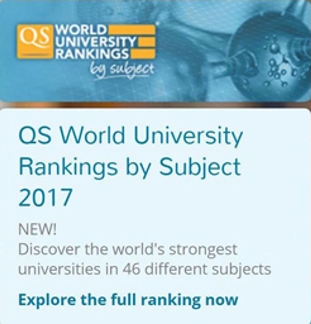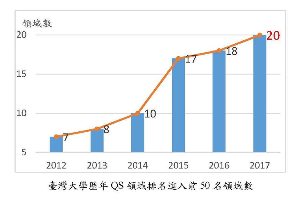英國高等教育調查機構QS(Quacquarelli Symonds)於106年3月8日公布2017年「QS World University Rankings by Subject」,本校五大主領域「藝術與人文」、「工程與科技」、「生命科學與醫學」、「自然科學」、「社會科學與管理學」排名全數進入世界前50名,本年度共評比46個領域,本校共有36個領域上榜,其中20個領域排名前50,33個領域排名前100