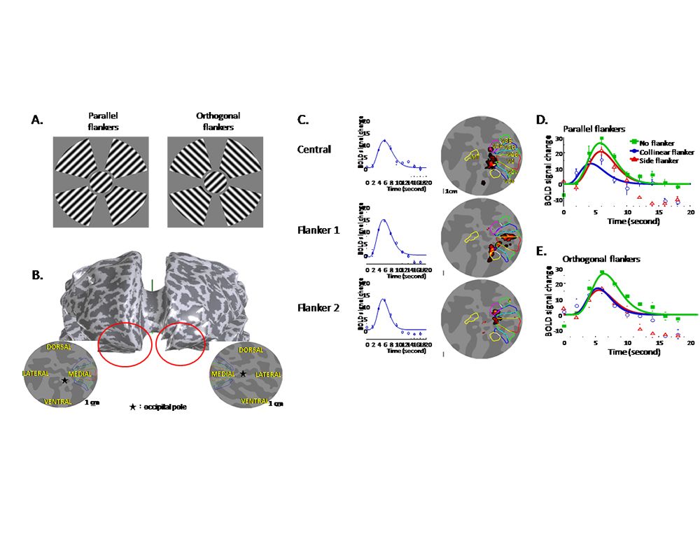 其次,我們利用了共線效果,亦即對共線的兩個刺激反應的兩組神經之間的互動,遠大於對兩組不共線刺激反應的神經。我們的實驗刺激一共含有三種成分,包括目標刺激以及兩種伴側刺激(flanker)(圖一A)。目標刺激為位於螢幕中央的正弦波形光柵。第一種伴側刺激位於目標刺激共線的位置;第二種伴側刺激則在目標刺激兩側。伴側刺激也為正弦波形光柵,其指向可能為與目標刺激平行或正交。我們先量測目標刺激出現的腦部反應(圖一C)。接著測量不同情況的伴側刺激下,目標刺激引發之腦部活化的差別(圖一D, E)。結果顯示,所有的伴側刺激皆會使目標刺激引發的腦部活化下降,這種抑制會在伴側刺激與目標刺激指向相同且共線時最為強烈(圖一D)。因此,我們發現了兩種不同的側抑制,其一為一般性抑制,只要伴側刺激存在就會產生,並且對於伴側刺激的空間組態不敏感。其二則是空間組態特定的抑制, 與行為上的共線效果相關。