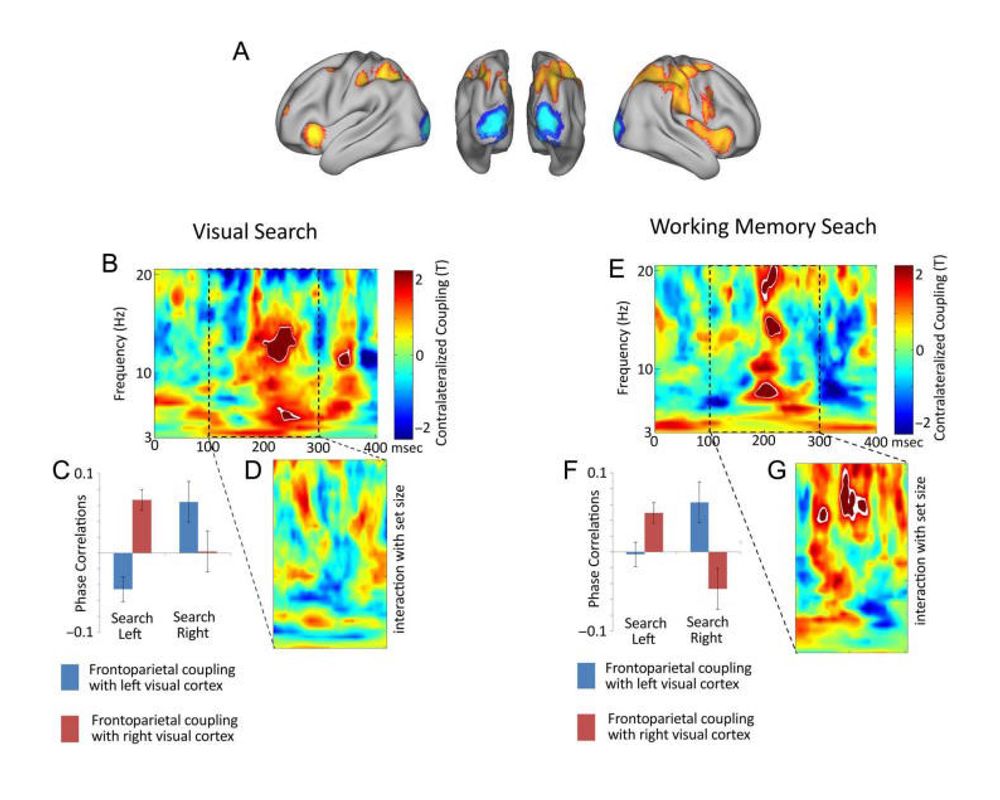 圖二:知覺(視覺)搜尋與記憶搜尋所涉及的大腦區域(紅黃色:前額葉與後頂葉神經網路;藍色:視覺皮質)(A);個體進行視覺搜尋時,前額葉與後頂葉皮質神經訊號與視覺皮質神經訊號,在知覺搜尋刺激出現後約200 ms即產生訊號相位共振(B、C、D);個體進行工作記憶搜尋時,前額葉與後頂葉皮質神經訊號與視覺皮質神經訊號,在記憶搜尋項目出現後約200 ms產生訊號相位共振(E、F、G)。進行視覺搜尋與工作記憶搜尋時,前額葉與後頂葉皮質神經訊號與視覺皮質神經訊號的共振均具有空間拓樸對應關係。