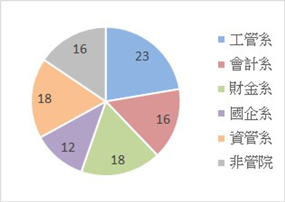 本跨領域課程獲得管理學院郭瑞祥院長、胡星陽副院長與各系系主任支持,同學們也都意識到其重要性,校內網路初選共有644人登記、第一堂課也有超過200人進教室尋求加簽機會(如圖1)。最後經過名額分配與抽籤,共計有103位均勻來自各系的同學修課(如圖2)。
