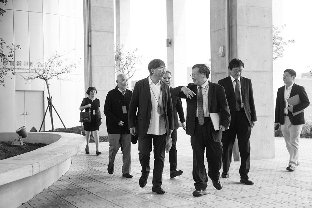 由臺大藝文中心主辦、社科院、總務處校園規劃小組共同合辦的「建築師的回訪:建築‧空間‧公共藝術」論壇於4/9,10號登場,舉辦四場精彩座談,壓軸場邀請社科院建築師伊東豊雄回訪,分享當初創作理念。圖為臺大副校長張慶瑞與院內長官一同迎接伊東豊雄,步向會場。(陳宥中攝)