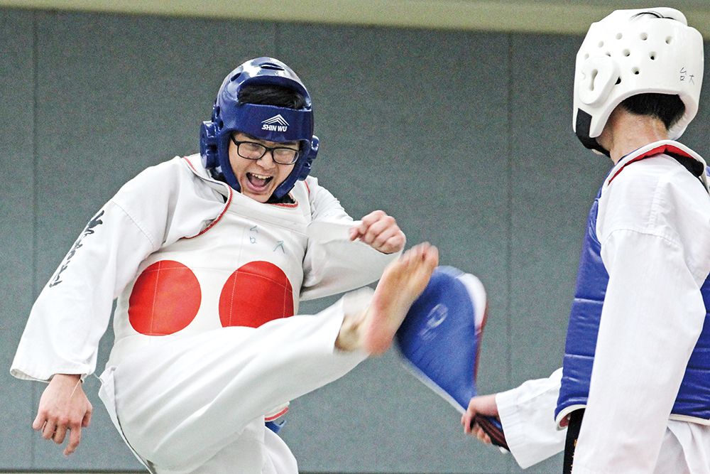 跆拳道的對打項目,經常透過模擬競賽來訓練隊員對格鬥技巧的掌握度。攝影/陳芊聿