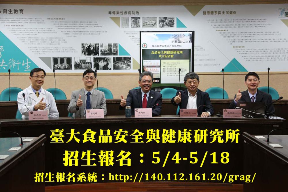 臺大食品安全與健康研究所,將整合現有與新聘公衛、醫學、社科法學、生農科技等專業師資,進行跨領域之基礎與應用研究,並培育通曉食品安全性評估、食品微生物與化學分析、風險管理溝通決策之人才。非常歡迎公衛、醫學領域、食品科學/營養、分析化學等背景人士報考;106學年度即開始碩士班招生(今年九月即入學),至多15名。簡章於4/27公告,5/4至5/18報名,5/26公告口試榜,6/2口試,6/6放榜。